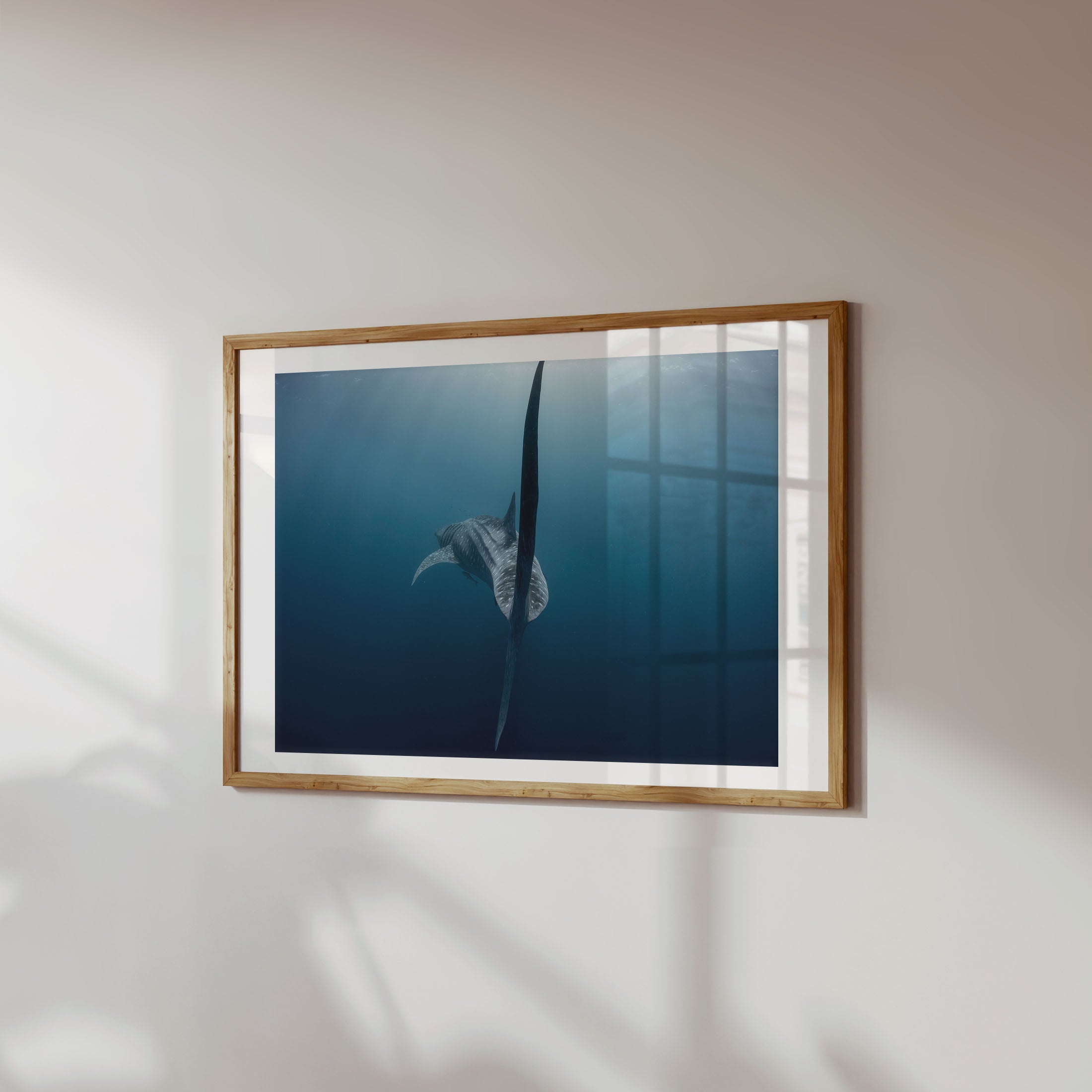 The majesty of the ocean with this beautiful print photography of a Whale Shark's tale. Dive deep with the biggest fish in the ocean. This image was captured on a single breath while freediving in the Indian Ocean. With its detailed features and vibrant colors, you can add a touch of the sea to any room.